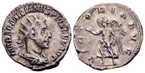 Op de bovenstaande antoninianus van Aemilianus staan in het voorzijdeomschrift nog twee veelvoorkomende keizerlijke eretitels te lezen: IMP AEMILIANVS PIVS FEL AVG.