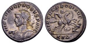 De voorzijde van deze antoninianus van Probus laat nog meer keizerlijke titulatuur zien: IMP C M AVR PROBUS P AVG.