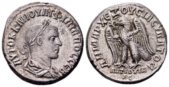 Een klein uitstapje naar de Romeinse provinciale muntslag. Hieronder staat een biljoenen tetradrachme van Philippus II (247-249) afgebeeld, geslagen in Antiochië in Syrië.