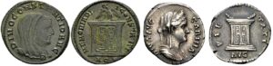 Pater (P, PT, PATER) – ‘Vader’. Als je als keizer aan het begin van je regering toevallig een beroemde vader als voorganger hebt, is het handig dat op munten te benadrukken. Op de postume munten van Constantijn de Grote, geslagen door zijn zoons, zien we dan ook het omschrift Divus Constantinus pater augustorum, oftewel ‘De vergoddelijkte Constantijn, vader van de keizers’.