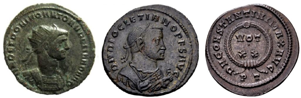 Links de munt waarop een keizer zich voor het eerst ‘Dominus’ laat noemen op een munt – Deo et Domino Nato Aureliano. In het midden een abdicatiefollis van Diocletianus met het omschrift Dominus Noster (DN) Diocletianus. Rechts een keerzijde met het omschrift Dominus Noster Constantinus Augustus.