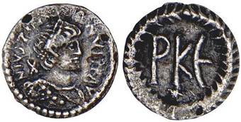 3a Justinian I AD 427-565, AR 120 nummi. The letters PK are Greek numerals for mark of value 120. Photo courtesy of Stack’s (Moneta Imperii Romani Byzantini 2009, lot 3083); 3b Justinian I AD 427-565, AR 125 nummi. The letters PKE are Greek numerals for mark of value 125. Photo courtesy of Stack’s (same auction, lot 3082)
