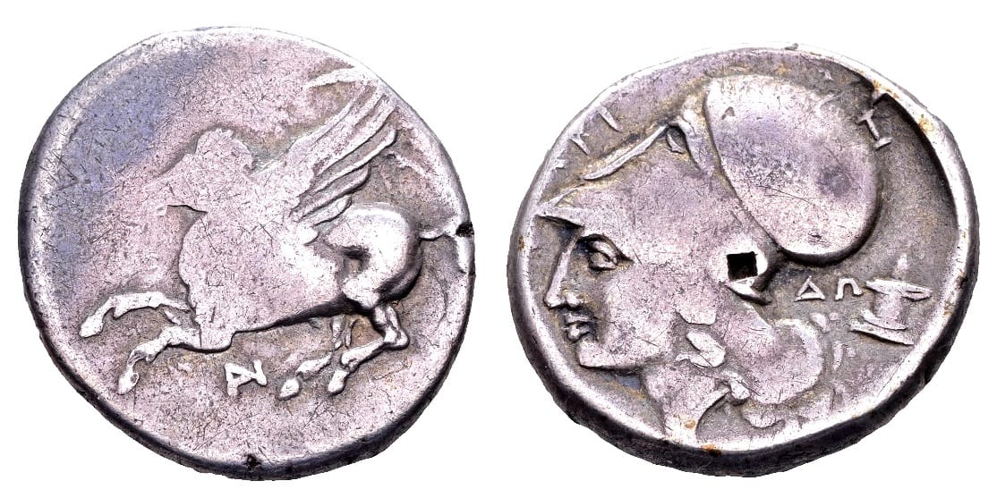 Hoofd van Athena naar links met Korinthische helm, ΔO en klein altaar erachter