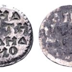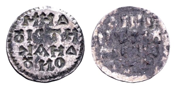 Inscriptie (negatief): ΔHM/HTPIU / ΔIAK/ONU (“Van de diaken Demetrios”), in vier regels in kransrand