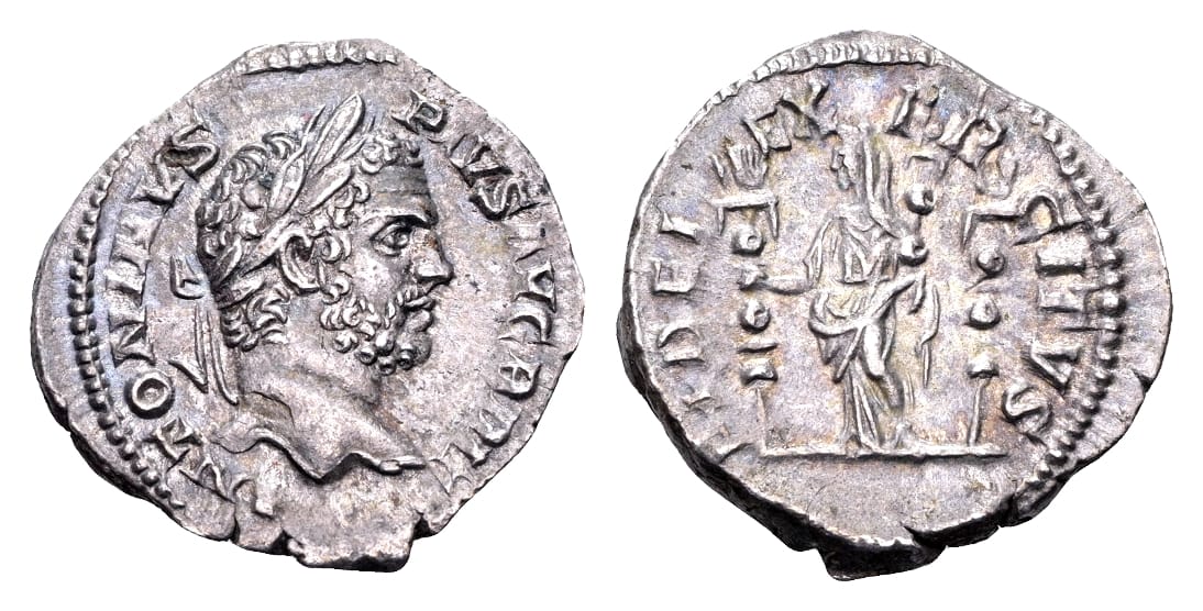 Caracalla 198-217. AR Denarius (19 mm, 3,40 gram) Rome 211 ANTONINVS PIVS AVG BRIT Gelauwerde buste naar rechts FIDEI EXERCITVS Fides staande naar links met standaard en legiona adelaar; een tweede standaard achter haar RIC 213. Prachtig