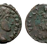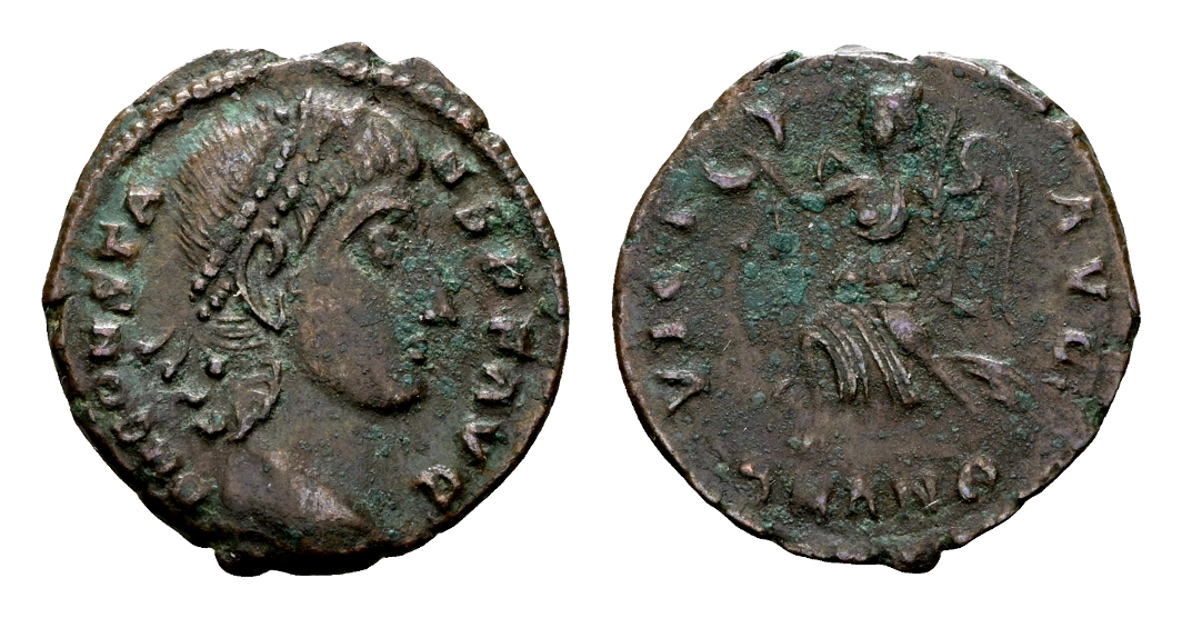 Constans 337-350. AE Follis (16 mm, 1.84 gram) Antiochië D N CONSTANS P F AVG Hoofd met diadeem naar rechts VICT AVG Victoria lopend naar links, met krans en palmtak; SMANT in afsnede RIC 66. Zeer fraai. Zeldzaam keerzijdetype
