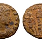 Delmatius Caesar 335-337. AE Follis (18 mm, 1,34 gram) FL DELMATIVS NOB C Gelauwerde buste met kuras naar rechts GLORIA EXERCITVS Twee soldaten met helm, tegenover elkaar staand, met speer en schild, standaard ertussen, afsnede onzeker Zeer fraai