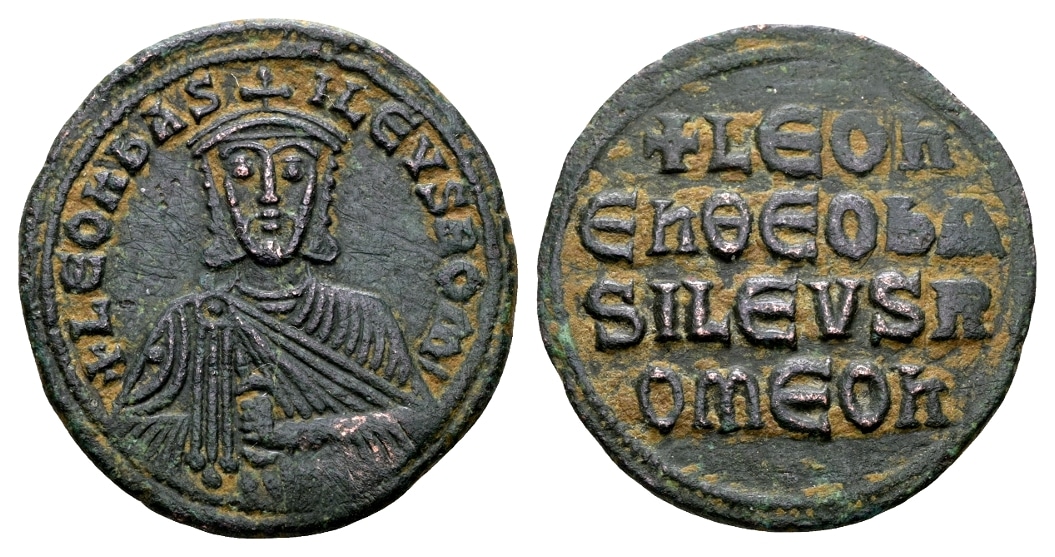 Leo VI 886-912. AE Follis (26 mm, 7.23 gram) Constantinopolis +LEON bASILEVS ROM Keizer Leo VI, frontaal, gekroond, met akakia +LEON / EN ΘEO bA/SILEVS R/OMEON in vier regels Sear 1729. Zeer fraai/Prachtig, lichte krasjes