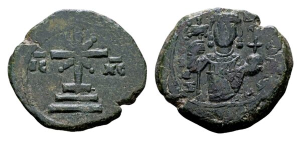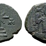 MANOYHΛ ΔEC-Π Halve figuur van Manuel staand, met labarum in de rechterhand en kruisglobe in de linkerhand