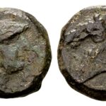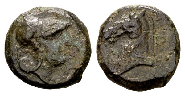 Romeinse Republiek AE Litra (17 mm, 6,16 gram) vóór 269 v.Chr. Geen omschrift Hoofd van Minerva met helm naar rechts ROMANO Kop van paard naar rechts Crawford 17/1d. Slight surface roughness, goed fraai