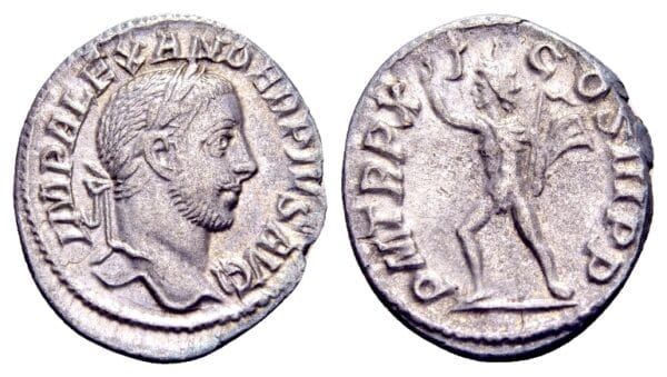 Severus Alexander 222-235, AR Denarius (19 mm, 2,68 gram) Rome 232 IMP ALEXANDER PIVS AVG; gelauwerd hoofd r. PM TR P XI COS III PP; Sol lopend naar links, met zweep, r. hand geheven RIC 114; Zfr/Pr