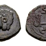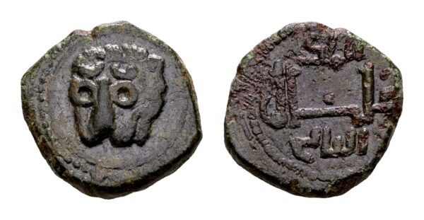 Sicilië, Normandiërs. Willem II. Koning 1166-1189. AE Follaro (13 mm, 2,38 gram) Messina Leeuwenkop frontaal Kufisch omschrift Spahr 118. MEC 425. Biaggi 1231. Zeer fraai