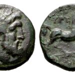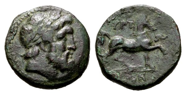 Thessalië, Gyrton. AE Trichalkon (20 mm, 7.50 gram) vroege 3e eeuw v.Chr. Hoofd van Zeus, gelauwerd, naar rechts Paard naar rechts; ΓΥΡΤ-ΩΝΙΩΝ BCD 83.7. Zeer fraai