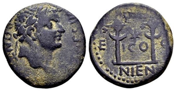 Titus Caesar 69-79, AE (19mm, 5,75 gram) Lycaonia, Iconium T CAES IM PONT; gelauwerd hoofd r. COL ICO-NIEN, E-Q; twee standaards, ster tussenin RPC 1610; Von Aulock, Lykanonien 299; Zfr