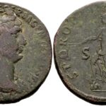 S P Q R OPTIMO PRINCIPI Pax staand naar links, met tak en hoorn des overvloeds, voet op gevangene Daciër, S – C in veld