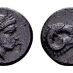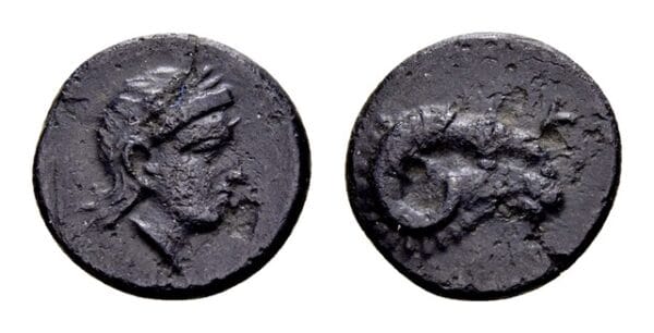 Troas, Kebren. AE (10mm, 0,86 gram) circa 387-310 v.C. Ramskop naar rechts, K boven Hoofd van Apollo r. SNG Aulock 1546; licht ruwe oppervlakten, Zfr+