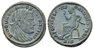 The reverse legend accompanying the type reads REQVIES OPTIMORVM MERITORVM, which translates as ‘the rest/retirement of the best and most meritorious [emperors]’. These emperors of course being Claudius II, Maximian and Constantius. There is something worth mentioning here, namely that the legend, stated in plural, does not match the single seated emperor depicted. The legend only makes sense when it is applied to the whole series of coins of the three emperors together. This is quite unique in Roman coinage: the average Roman citizen, who happened to read the legend of, for example, the Claudius specimen, had to search his purse to find out who were the other ‘best and most meritorious’ emperors.