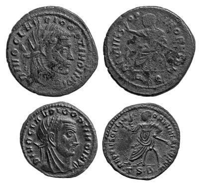 The series consists predominantly of half folles, measuring 15 mm in diameter. Only the mint in Rome struck the slightly larger full follis (18 mm) and only with the ‘emperor seated’ type (figure 1).